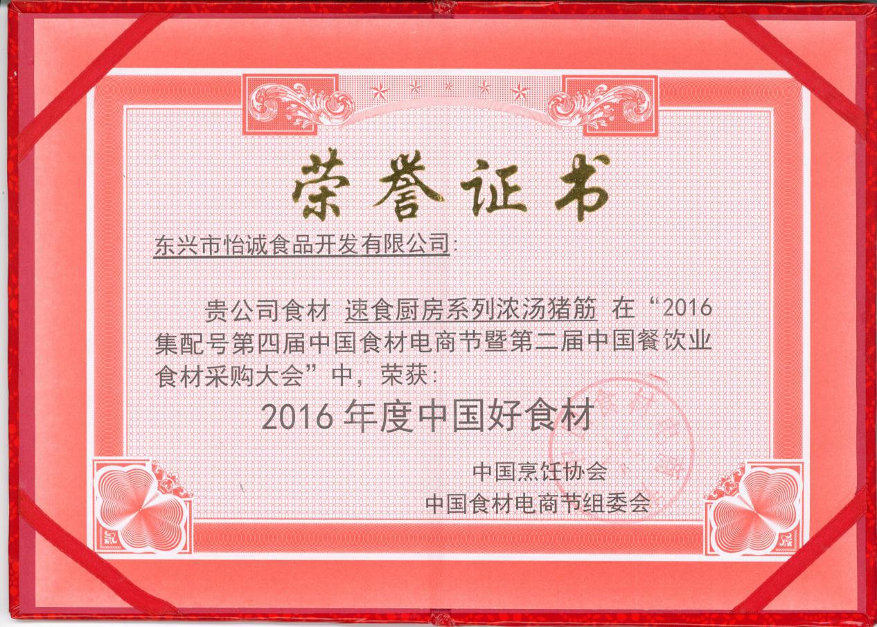 經(jīng)過長(zhǎng)達(dá)30天激烈的海選,線上平臺(tái)總投票數(shù)超過24萬(wàn)票,“濃湯白汁燉豬筋”菜肴在82家參選商中脫穎而出,最終獲得“2016年度第四屆電商食材節(jié)中國(guó)好食材獎(jiǎng)”。并且創(chuàng)制本菜式的公司星級(jí)廚師團(tuán)隊(duì)亦以其精湛廚藝獲得大會(huì)頒發(fā)“中國(guó)好菜式”獎(jiǎng)項(xiàng)。
