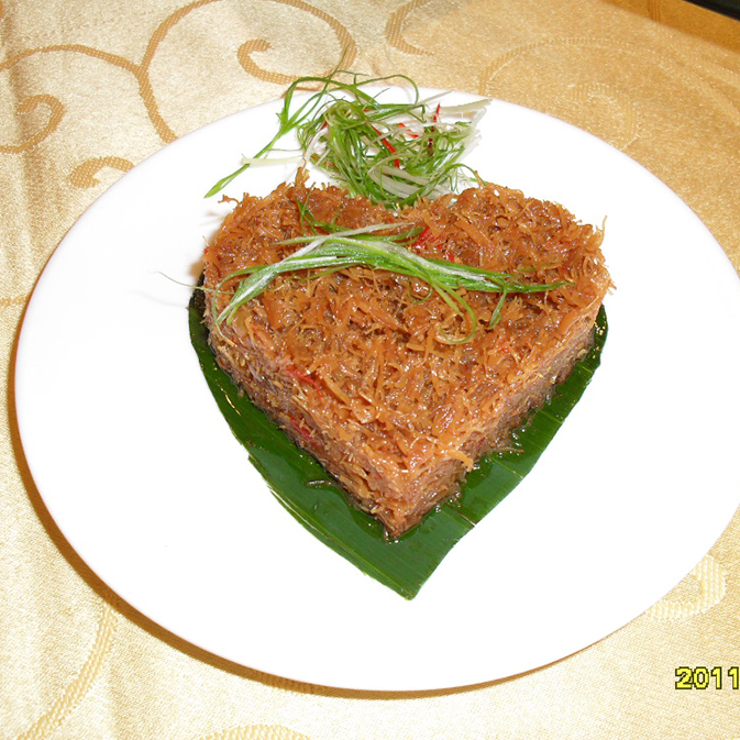 配料:怡誠牌瑤柱絲香辣罐頭、蛋清、栗子、松子仁、紫米、蔥花