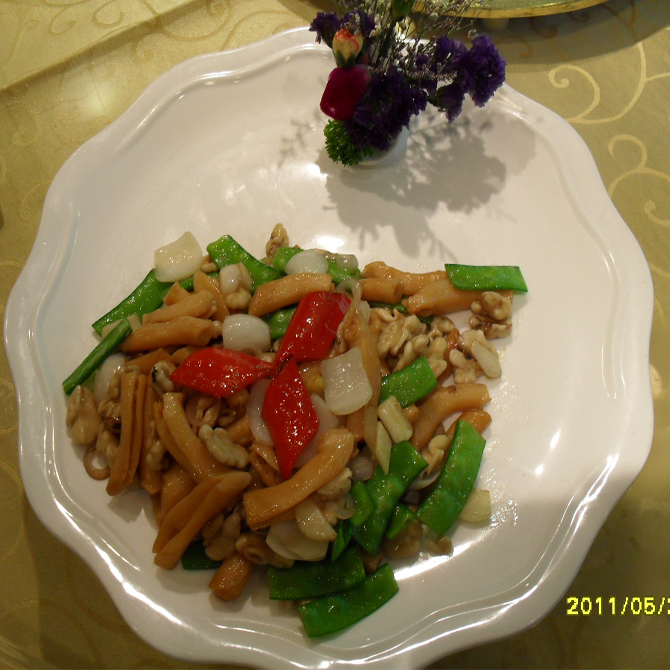 配料:海洋王宮蘆筍貝罐頭、百合、核桃仁、荷蘭豆、圓辣椒