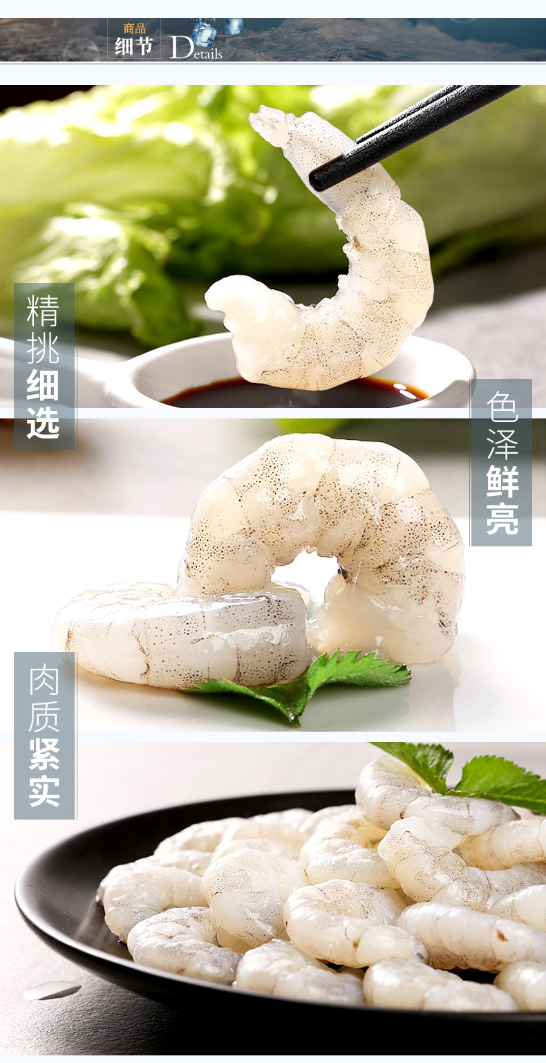 南美白對蝦原產(chǎn)于南美洲太平洋沿岸海域,大多數(shù)棲息于泥質(zhì)海底,生長發(fā)育條件優(yōu)異,體內(nèi)營養(yǎng)豐富。南美白對蝦外表呈青灰色,蝦殼薄而蝦肉飽滿,肉質(zhì)鮮美并且含肉率高,因而深受人們喜愛,是餐桌上常見的海鮮菜肴。本產(chǎn)品選用北部灣海域捕撈的鮮活白對蝦為原料,運用專業(yè)冷鏈物流運輸設備,把白對蝦迅速地運送到潔凈的生產(chǎn)車間內(nèi),專業(yè)處理去頭去殼,并以完善的冷凍保鮮技術(shù)和嶄新的高端流水生產(chǎn)線進行生產(chǎn)加工,使白對蝦仁能在新鮮狀態(tài)下加工成為速凍產(chǎn)品,最大限度地保存了鮮活白對蝦的鮮美品質(zhì)。