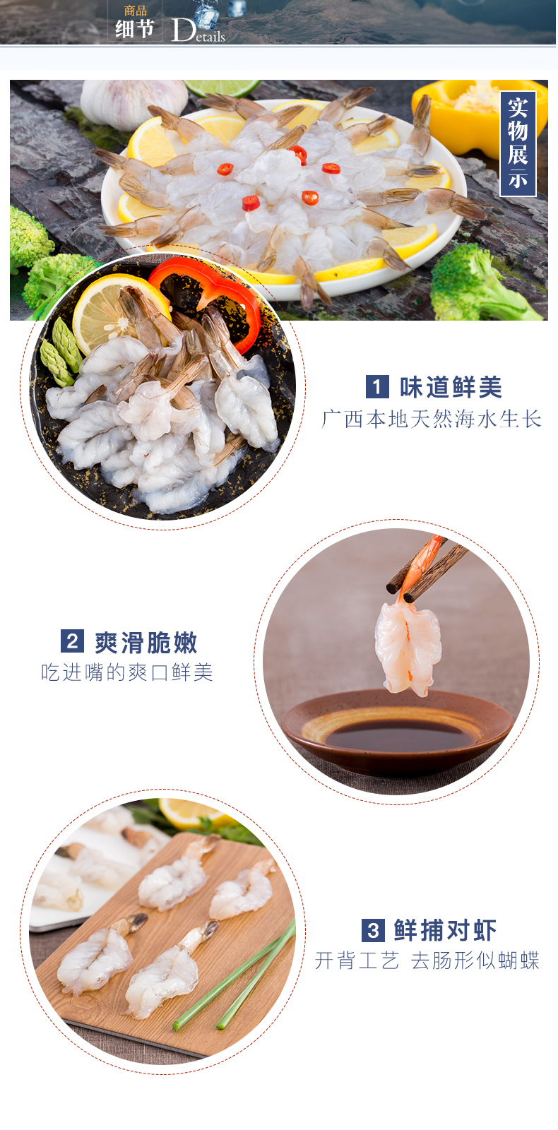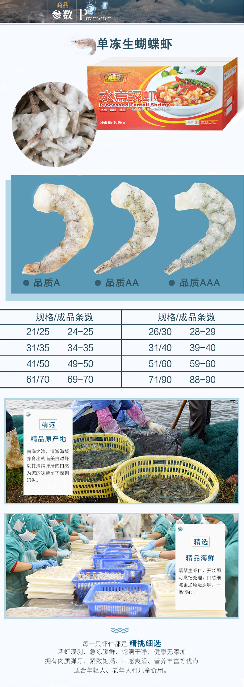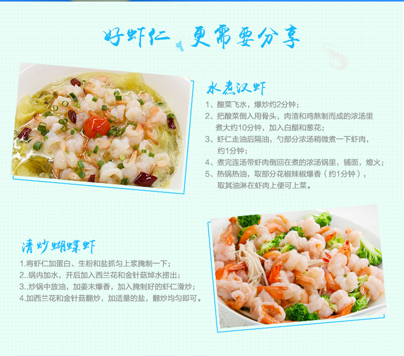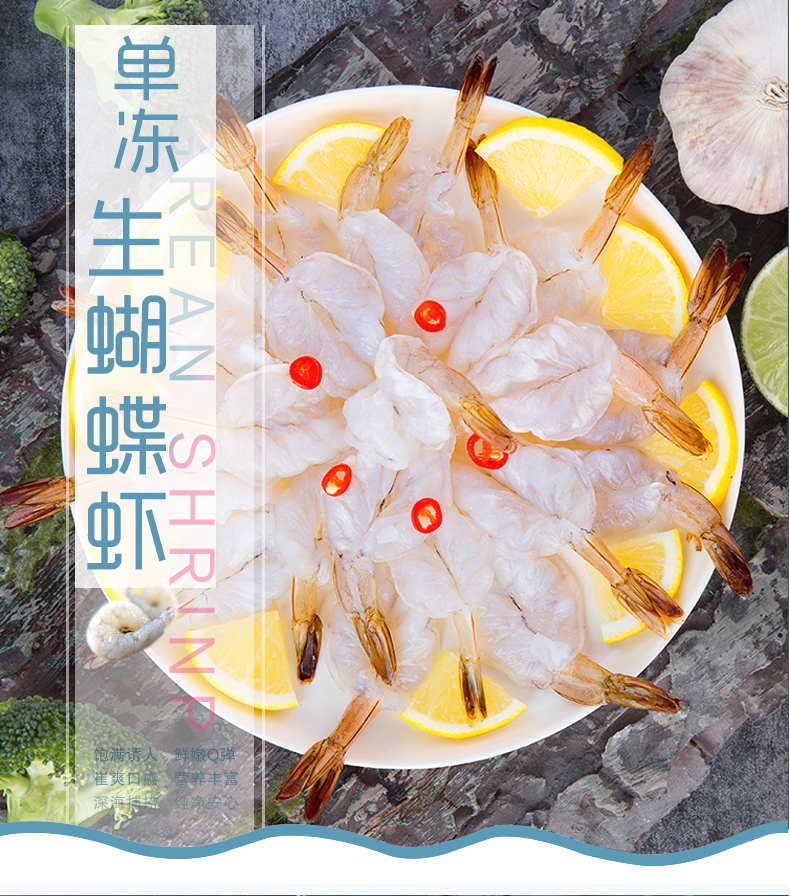 本產(chǎn)品選用北部灣海域捕撈的鮮活白對蝦為原料,運(yùn)用專業(yè)冷鏈物流運(yùn)輸設(shè)備,把白對蝦迅速地運(yùn)送到潔凈的生產(chǎn)車間內(nèi),專業(yè)處理去頭去殼,去除蝦線保留蝦尾,再沿蝦體中部將蝦肉剖開,切割過程中不損害蝦體天然肉質(zhì)纖維,最終使蝦肉整體呈蝴蝶狀。在高端流水生產(chǎn)線進(jìn)行生產(chǎn)加工下,蝴蝶蝦肉能在新鮮狀態(tài)下成為速凍產(chǎn)品,最大限度地保存了蝴蝶蝦肉的鮮美品質(zhì)。產(chǎn)品包裝美觀實(shí)用,分量充足,食用方便,蝦肉外形精致,口味鮮甜清新,可用于烹制黃金蝴蝶蝦、翡翠蝴蝶蝦等日常家庭菜肴或各式餐飲場合。