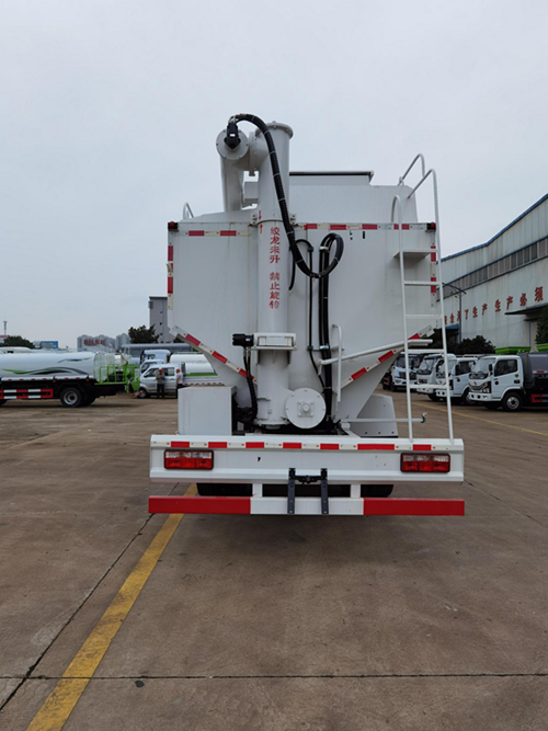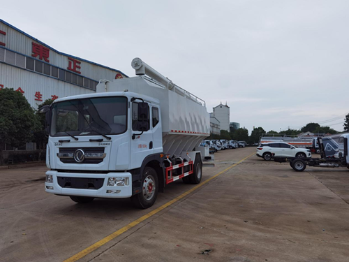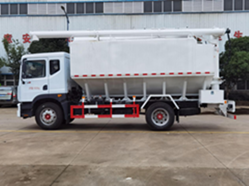 散裝飼料運輸車,散裝飼料車的飼料罐架設(shè)在卡車的底盤上,罐頂開有進(jìn)料口.頂部的一根螺旋輸送卸料管(俗稱卸料絞龍)則可自由回轉(zhuǎn)和抬升,抬升的仰角可達(dá)60度。運輸時,頂部的螺旋管平臥在罐頂;卸料時則抬起,使管端的出料口與畜禽飼養(yǎng)場貯料罐頂部的進(jìn)料門相接,駕駛室內(nèi)裝有操縱裝置(操縱裝置也可裝置在罐體尾部),卸料時通過車底的動力輸出軸和減速器來驅(qū)動螺旋,以完成卸料。