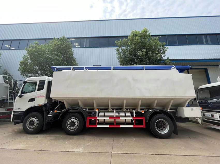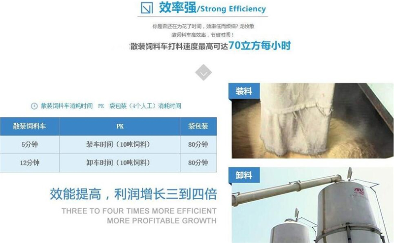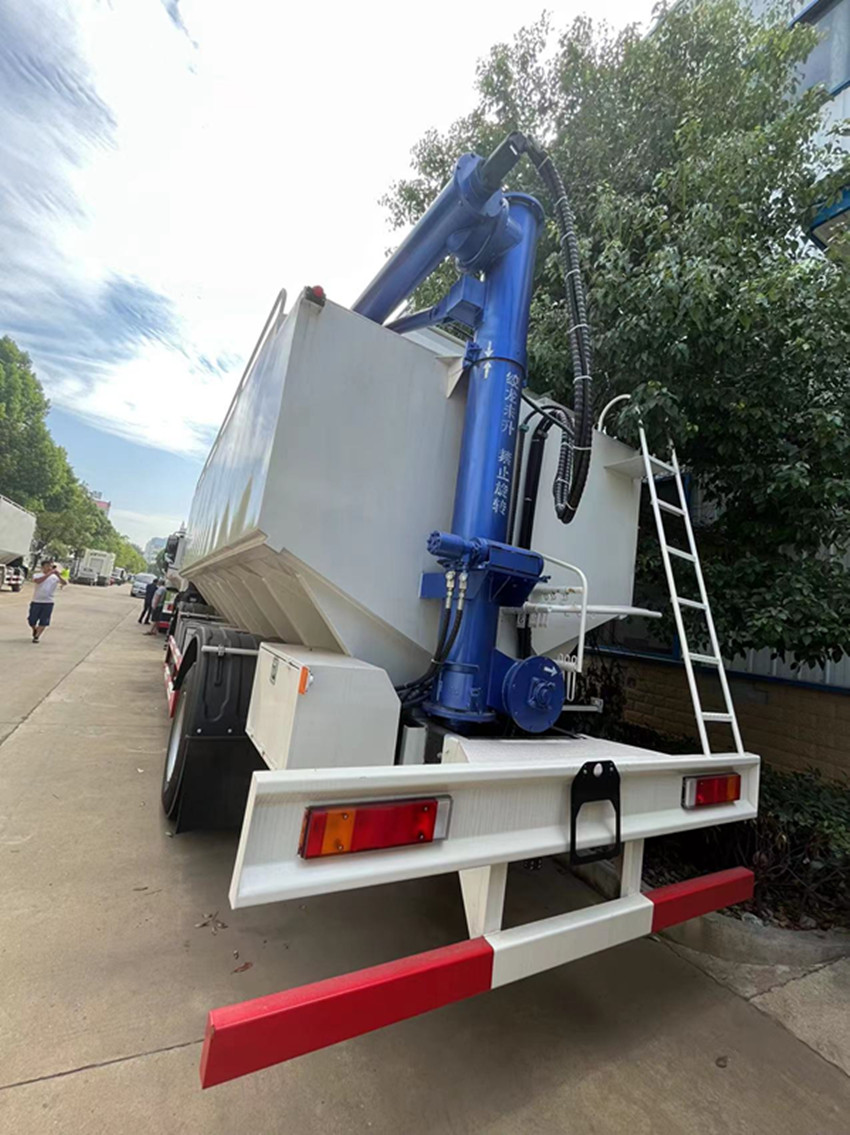 散裝飼料運(yùn)輸車,散裝飼料車的飼料罐架設(shè)在卡車的底盤上,罐頂開有進(jìn)料口.頂部的一根螺旋輸送卸料管(俗稱卸料絞龍)則可自由回轉(zhuǎn)和抬升,抬升的仰角可達(dá)60度。運(yùn)輸時,頂部的螺旋管平臥在罐頂;卸料時則抬起,使管端的出料口與畜禽飼養(yǎng)場貯料罐頂部的進(jìn)料門相接,駕駛室內(nèi)裝有操縱裝置(操縱裝置也可裝置在罐體尾部),卸料時通過車底的動力輸出軸和減速器來驅(qū)動螺旋,以完成卸料。