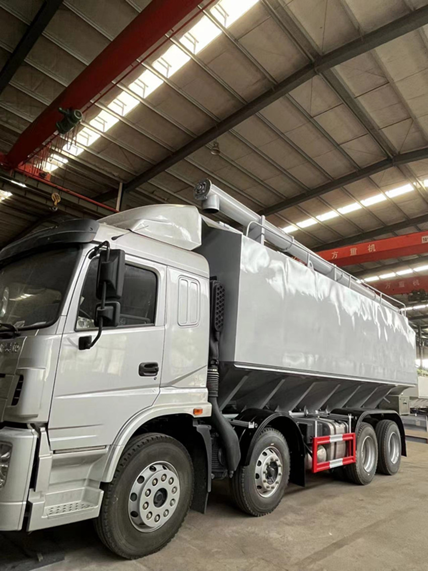散裝飼料運輸車,散裝飼料車的飼料罐架設(shè)在卡車的底盤上,罐頂開有進料口.頂部的一根螺旋輸送卸料管(俗稱卸料絞龍)則可自由回轉(zhuǎn)和抬升,抬升的仰角可達60度。運輸時,頂部的螺旋管平臥在罐頂;卸料時則抬起,使管端的出料口與畜禽飼養(yǎng)場貯料罐頂部的進料門相接,駕駛室內(nèi)裝有操縱裝置(操縱裝置也可裝置在罐體尾部),卸料時通過車底的動力輸出軸和減速器來驅(qū)動螺旋,以完成卸料。